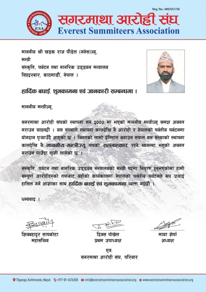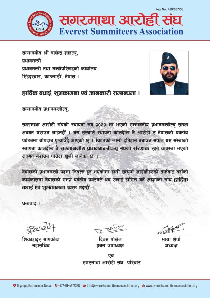 In the month of Mangsir, 2057 B.S. (2000 A.D.), on a cold day in Kathmandu, journalist Diwas Pokhrel was discussing Everest related issues with trekking Businessmen Keshav Poudel and Mahadev Sharma. Pokhrel asked, “What if we form an Everest Summiteers Association?” Poudel and Sharma thought it was a great idea. Since Pokhrel was also a tourism journalist, drafting the Association’s rules wasn’t difficult for him. He immediately started working on it. While the rules were being prepared, climber Wangchu Sherpa was informed about the Association. At first, Wangchu said he might not have time to be involved. But after hearing from Pokhrel and Sharma, he agreed to support the idea. The discussions took place at a trekking company’s office in Thamel, Kathmandu. Wangchu Sherpa then gathered well-known climbers like Speed Kaji Sherpa, Babu Chhiri, Apa, and others. After discussions, they decided to form the association. On Poush 11, 2057 B.S.(December 26, 2000), the association was officially registered at the District Administration Office, Kathmandu.